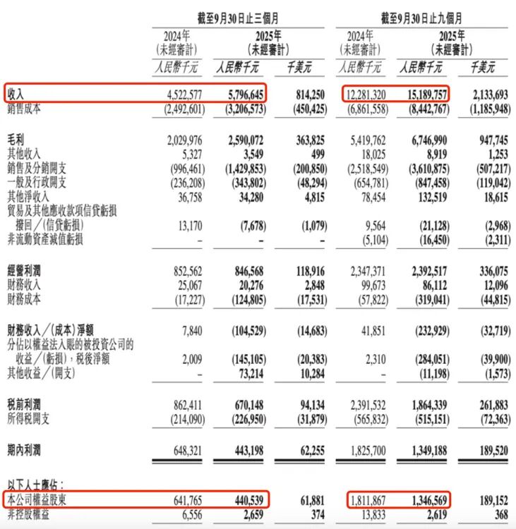 2025年Q3,集团总营收57.97亿元,同比增长28%,季度收入首次突破50亿元的大关;季度归母净利润4.41亿元,同比减少31%。2025年前三季度,集团总营收151.90亿元,同比增长24%;归母净利润13.47亿元,较上年同期的18.12亿元,减少了近5亿元。