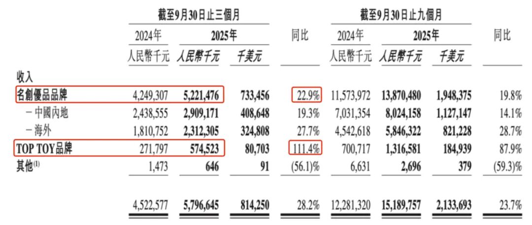 旗下潮玩业务 TOP TOY Q3实现收入5.7亿元(注:来自TOP TOY品牌的收入仅指来自外部的收入),同比增长111.4%,今年前三季度收入13.2亿元,同比增长87.9%。
