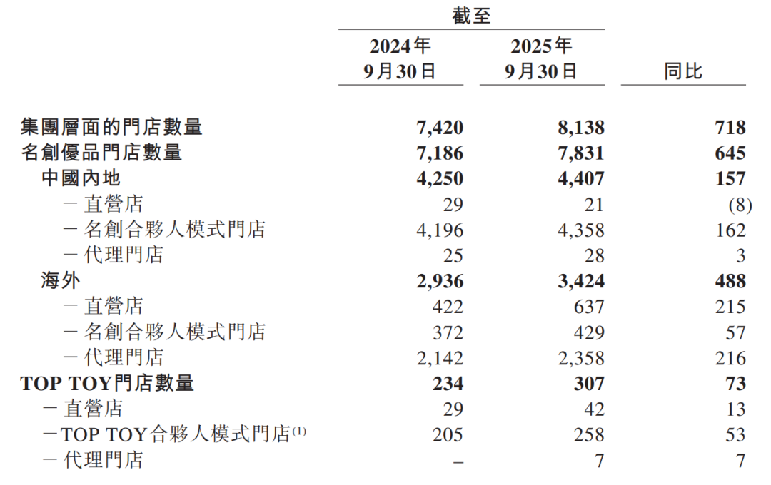 截至2025年9月30日,MINISO全球门店数量为7831家,同比净新开645家;TOP TOY门店数量为307家,同比净新开73家。